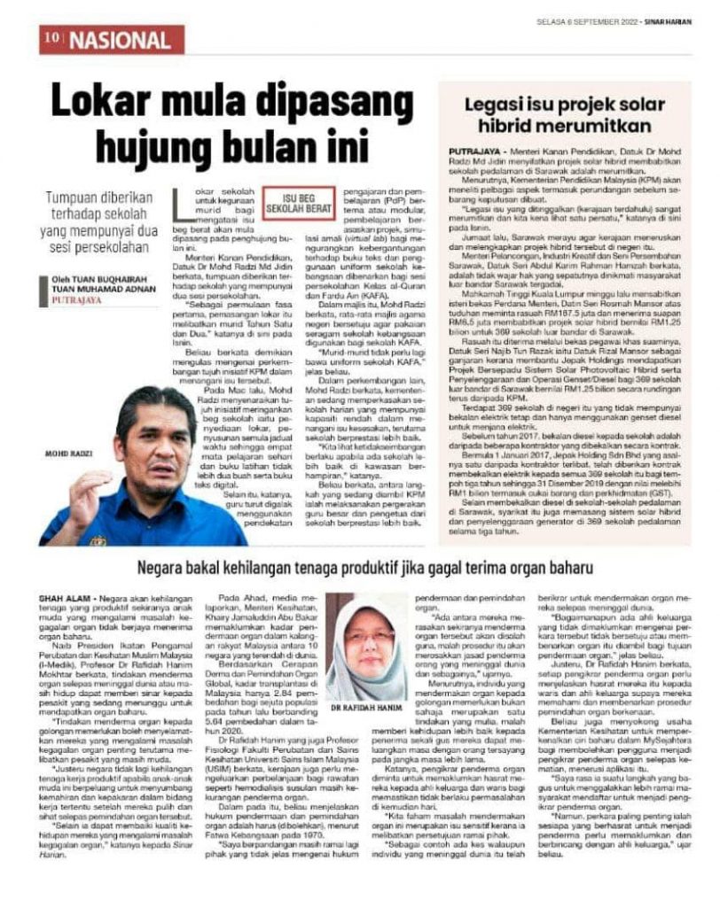SHAH ALAM – Negara akan kehilangan tenaga yang produktif sekiranya anak muda yang mengalami masalah kegagalan organ tidak berjaya menerima organ baharu. Naib Presiden Ikatan Pengamal Perubatan dan Kesihatan Muslim Malaysia (I-Medik), Profesor Dr Rafidah Hanim Mokhtar berkata, tindakan menderma organ selepas meninggal dunia atau masih hidup dapat memberi sinar baharu kepada pesakit yang sedang