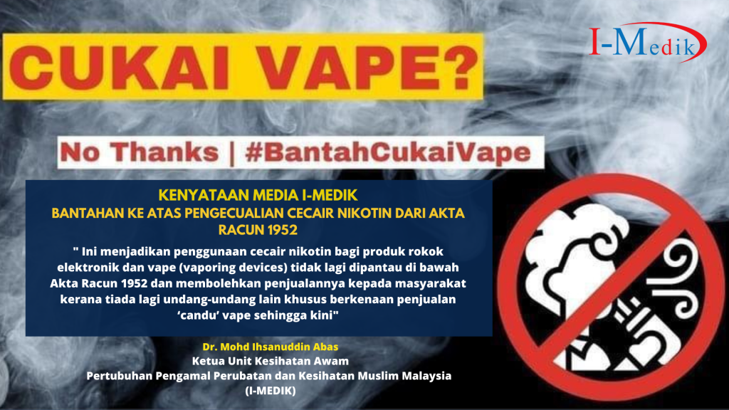 I-MEDIK ingin menegaskan kembali pendirian dan komitmen kami untuk mendesak Kerajaan menghalang sebarang usaha penggunaan dan penjualan nikotin tanpa kawalan dibenarkan